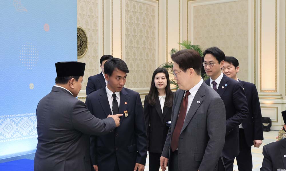 Tampil gagah dengan setelan jas lengkap, Sugianto berdiri sejajar dengan para tamu undangan terhormat lainnya tepat di samping Presiden Korsel. Diapit oleh dua pemimpin negara, Sugianto tampak akrab bercakap-cakap dengan Presiden Prabowo, menciptakan pemandangan hangat yang menunjukkan betapa berartinya kontribusi warga Indonesia di kancah internasional.